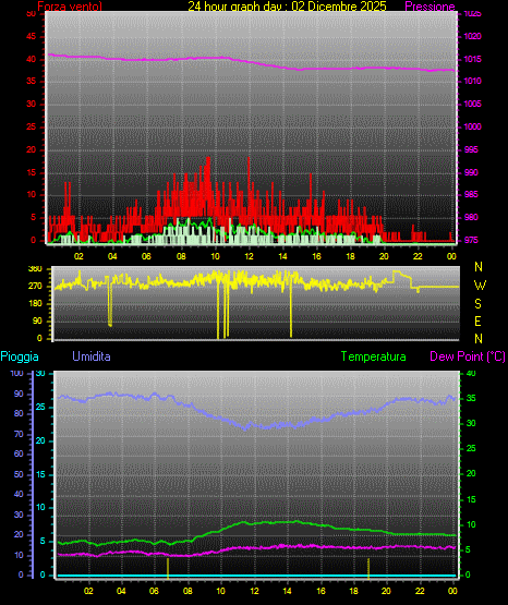 Velocità massima di raffica = 18.5 km/h da 291°(WNW) giorno 02 tempo 11:59