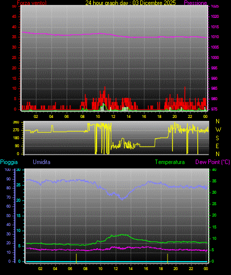Velocità massima di raffica = 11.1 km/h da 295°(WNW) giorno 03 tempo 21:16