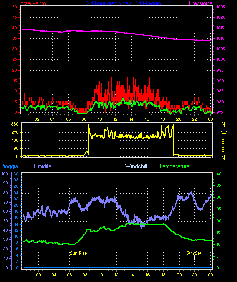 Velocità massima di raffica = 18.5 km/h da 360°( N ) giorno 02 tempo 14:54