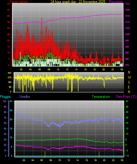 Velocità massima di raffica = 27.8 km/h da 245°(WSW) giorno 03 tempo 03:21